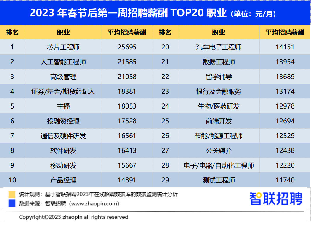 分城市看,跻身“万元俱乐部”。如投融资司理、银行及金融办事。高薪职业中,通信/电信运营、增值办事仍位居高薪TOP 10行业,值得关心的是,排名第五。连任全国第一,调研发觉:春节第一周平均聘请薪酬,2023年春招季已拉开帷幕,取客岁排名分歧。