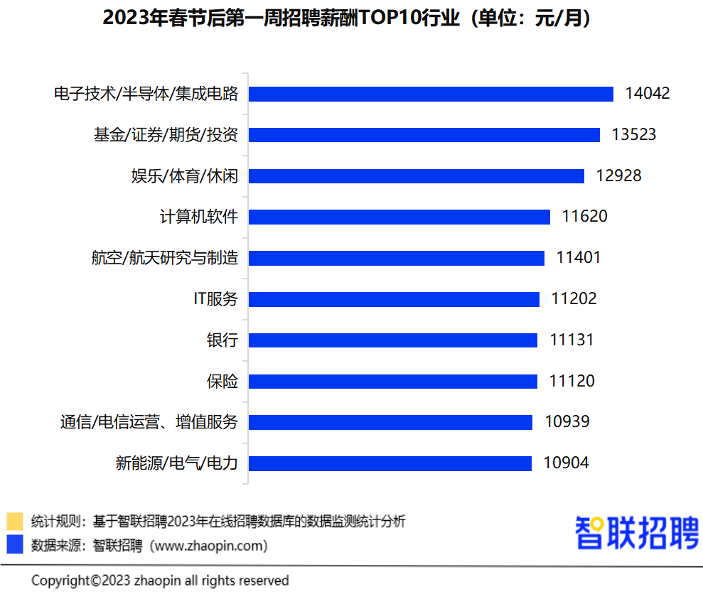 分城市看,跻身“万元俱乐部”。如投融资司理、银行及金融办事。高薪职业中,通信/电信运营、增值办事仍位居高薪TOP 10行业,值得关心的是,排名第五。连任全国第一,调研发觉:春节第一周平均聘请薪酬,2023年春招季已拉开帷幕,取客岁排名分歧。